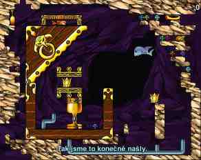 Veľkou rybou choďte o dve políčka doprava a teraz o políčko doľava. Ten budík nesmiete pustiť. Teraz budete hýbať iba malou rybou, až do odvolania. Choďte o tri políčka doprava, klesnite úplne dole a potlačte tú vec (drevo) úplne doľava. Klesnite dole, teraz choďte doprava, zase klesnite, potom doľava, ešte klesnite, a teraz úplne doprava. Stúpnite o dve políčka a dotlačte tú vec úplne doľava (lodné kormidlo položené na topánke). Teraz plávajte úplne doprava, stúpnite o tri políčka (pritom nadvihnete tu žltú vec (lodnú skrutku)), odplávajte zpod tej veci doľava a tú vec teraz zhoďte doprava. Teraz vplávajte pod tú sekeru naľavo a dotlačte tú vázu doľava. Teraz tlačte sekeru doprava, až dokiaľ ju budete môcť oboplávať (asi 8 ťahov). Teraz potlačte Chárona (to je ten hnedý predmet v tvare člna napravo od vás) o políčko doprava. Teraz plávajte k tej harmonike položenej na tom poháriku (tým pohárom zatiaľ nehýbte). Zdvihnite harmoniku úplne hore a plávajte úplne doľava (pri tom zhodíte tú kotvu a harmonika spadne dole). Plávajte naspäť a o políčko doľava potlačte tú reťaz spolu s kotvou. Teraz plávajte hore a zhoďte tie tri predmety (dve medúzy a modrú fľašku) doprava na tú harmoniku. Asi v strede obrazovky je čižma, plávajte k nej a nadvihnite ju o políčko. Teraz preplávajte úplne doľava (POZOR : nezhoďte pri tom nič na veľkú rybu). Potlačte ten budík, ktorý drží veľká ryba, o políčko doprava (spadne na tú zelenú vázu). Veľkou rybou zhoďte budík s tej vázy doprava. Teraz tlačte tú vázu s budíkom doprava, kým nespadnú. Malou rybou oboplávajte veľkú rybu a plávajte až k tej harmonike. Veľkou rybou tlačte sekeru úplne doprava, a potom stúpnite o políčko. Malou rybou sekeru dotlačte úplne doľava. Malou rybou zhoďte ten pohárik pod harmonikou doprava. Dotlačte sa doprava a zdvihnite harmoniku o dve políčka. Veľkou rybou zachyťte tú harmoniku. Malou rybou podplávajte veľkú rybu. Veľkou rybou zdvihnite harmoniku úplne hore. Malou rybou potlačte Chárona o políčko doľava a vráťte sa doprava. Veľkou rybou potlačte o políčko predmety naľavo od vás. Malou rybou potlačte Chárona opolíčko doľava, stúpnite hore a znova potlačte Chárona o políčko doľava. Pustite tu kotvu na zem. Veľkou rybou odplávajte zpod harmoniky a odtlačte oceľový valec doľava. Malou rybou potlačte ten meč naľavo hore doľava a ten rebrík o políčko doprava. Teraz už môžete v pohode odplávať z miestnosti.