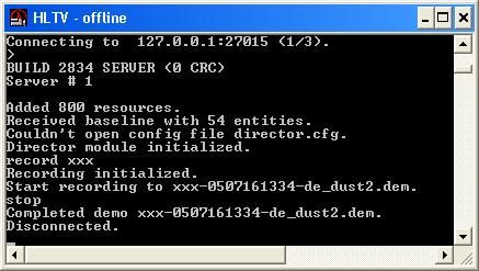 Na takto pripojenom HLTV spustíme nahrávanie nasledovne. Do príkazového riadku napíšeme record xxx pričom xxx znamená názov nahrávaného dema.